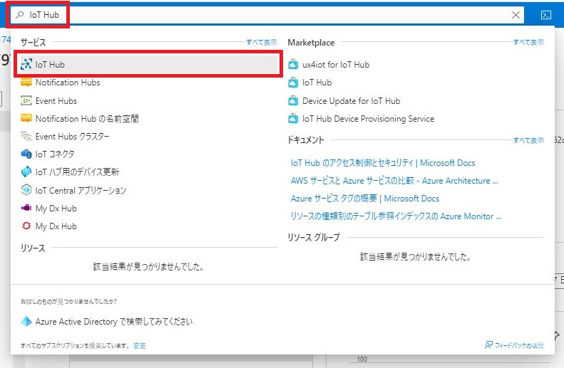 画面上部の検索窓にて「IoT Hub」と検索し、検索結果中の[IoT Hub]をクリックします。
