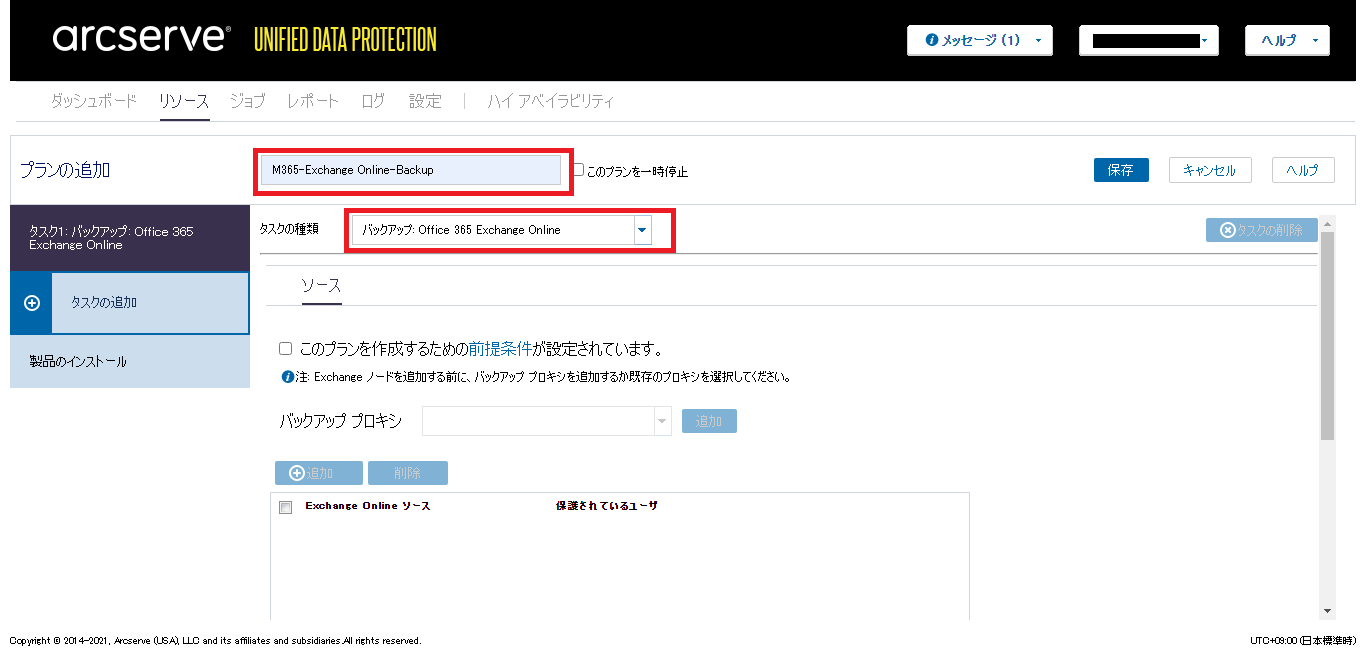 - 任意の「プラン」名を入力し、「タスクの種類」のドロップダウンリストで[バックアップ: Office 365 Exchange Online]をクリックします。