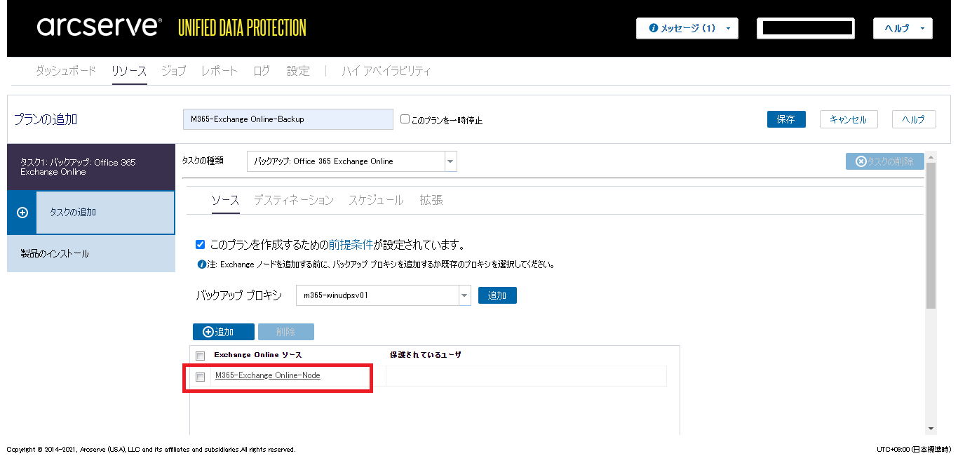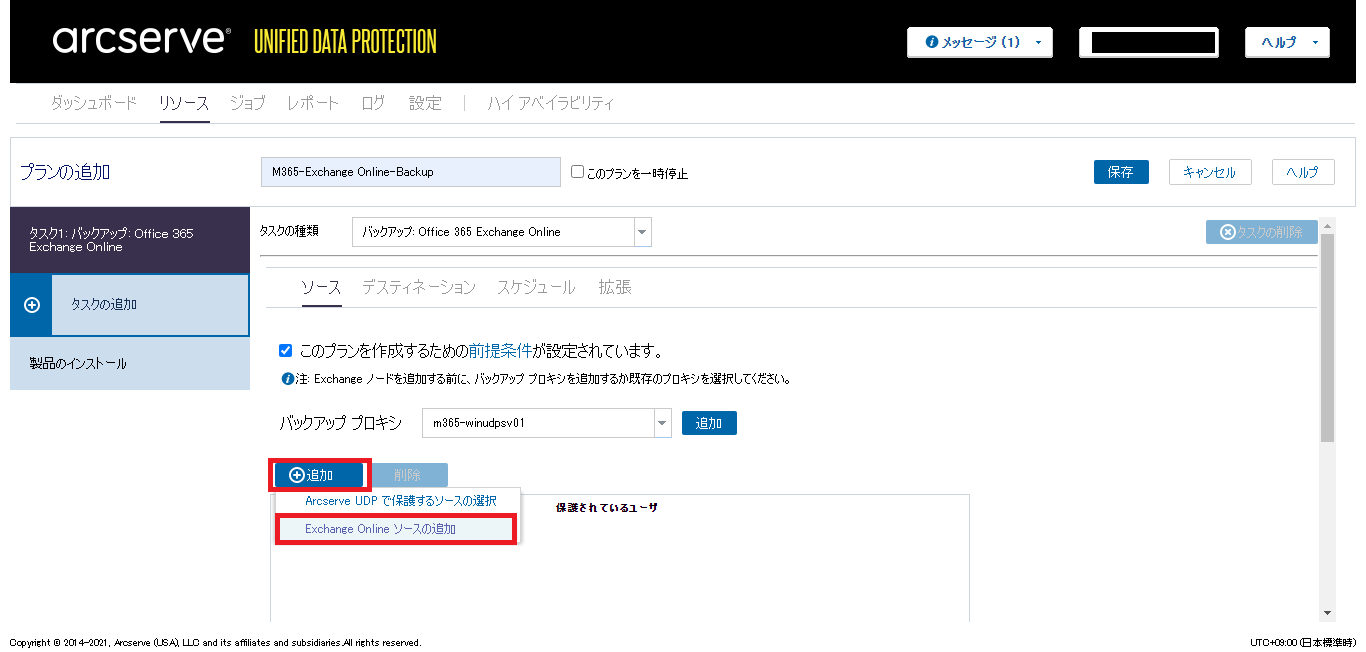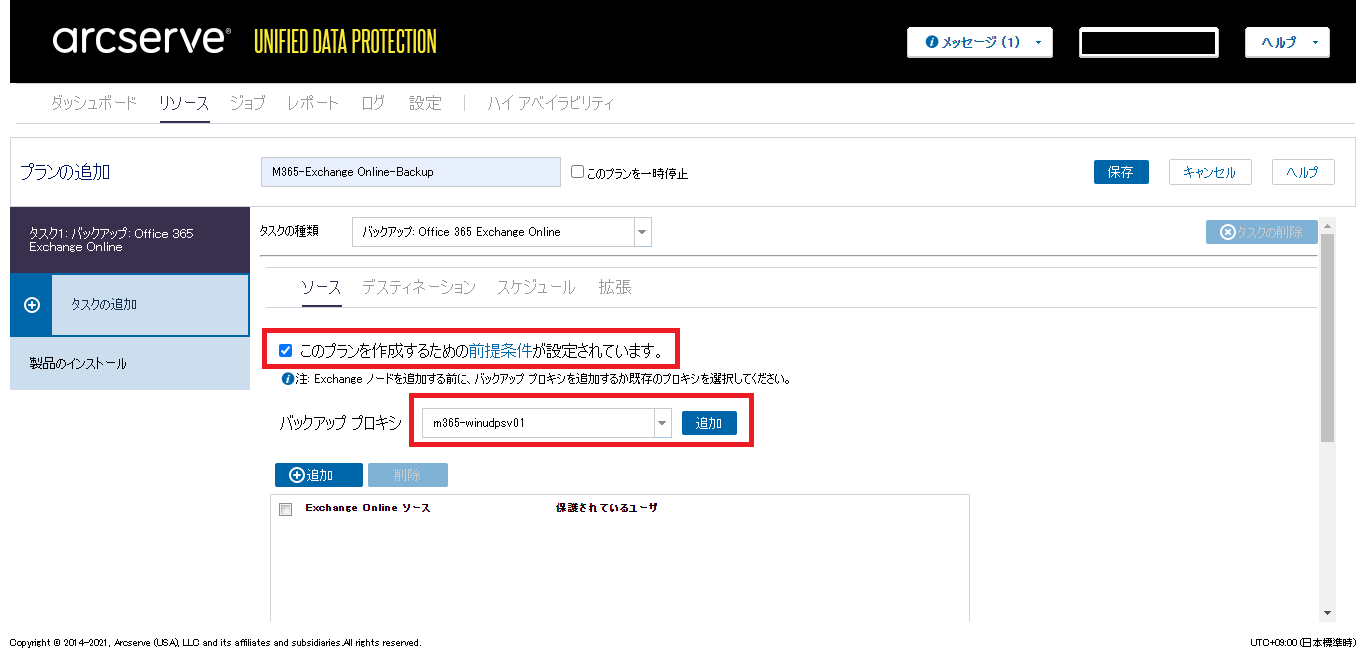 - [ソース]タブの[このプランを作成するための前提条件が設定されています。]にチェックを入れ、バックアッププロキシなどの必要な情報を設定します。
