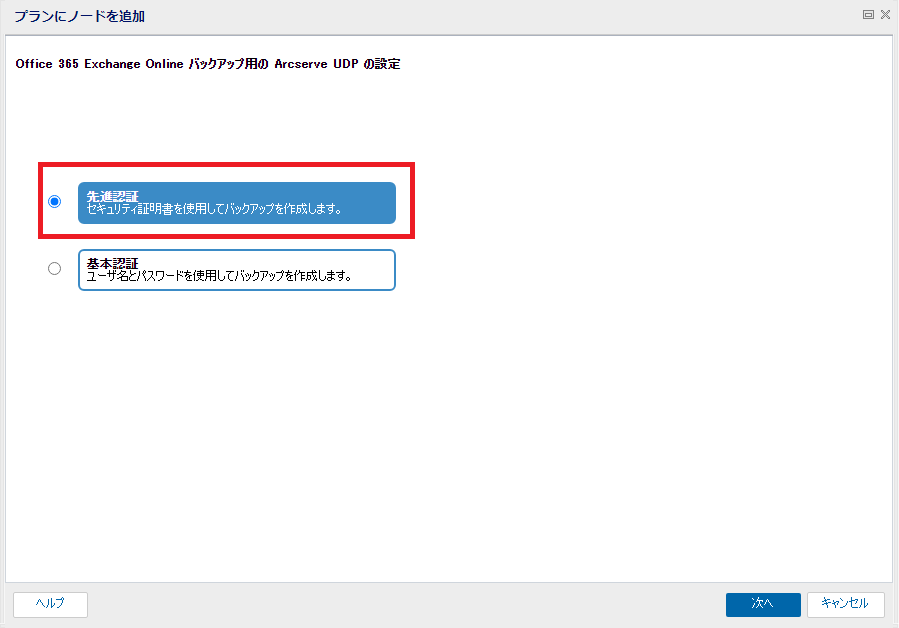 - 「プランにノードを追加」の画面が表示されるので、[先進認証]を選択し[次へ]をクリックします。