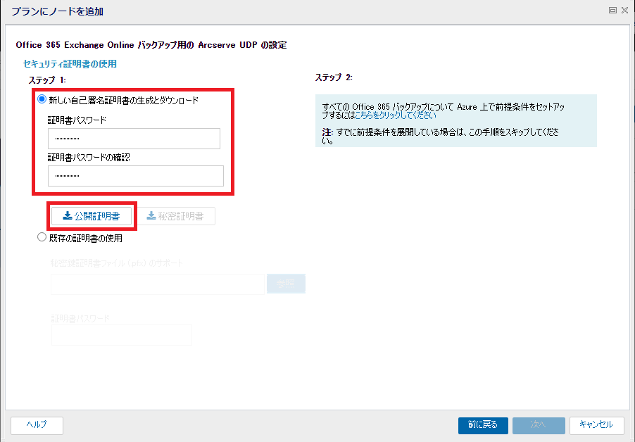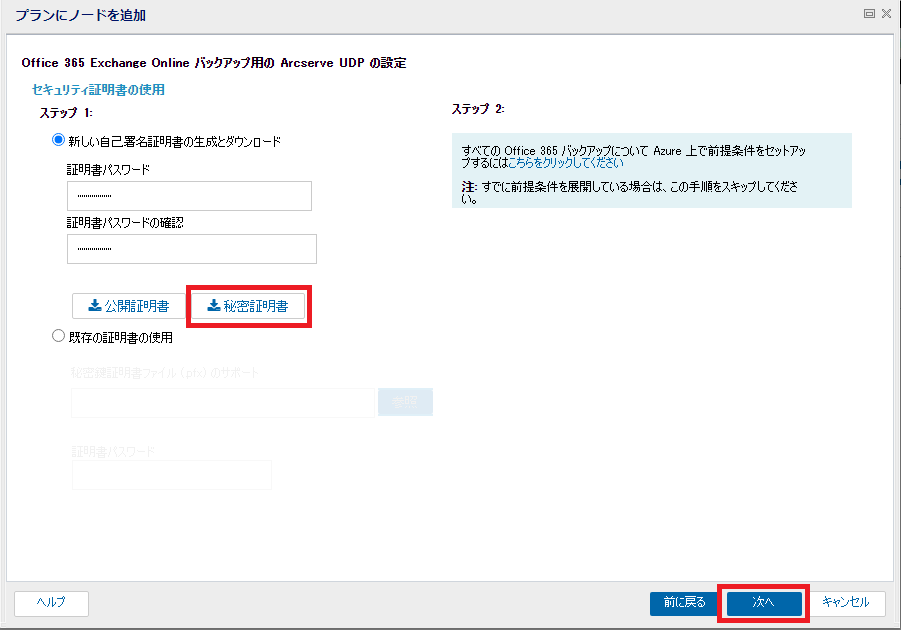 - ArcserveUDPの画面に戻ります。公開鍵証明書をダウンロード後、秘密証明書もダウンロード可能となります。2回目以降は「既存の証明書の使用」で秘密証明書を使用するため任意の場所に保存します。[次へ]をクリックします。