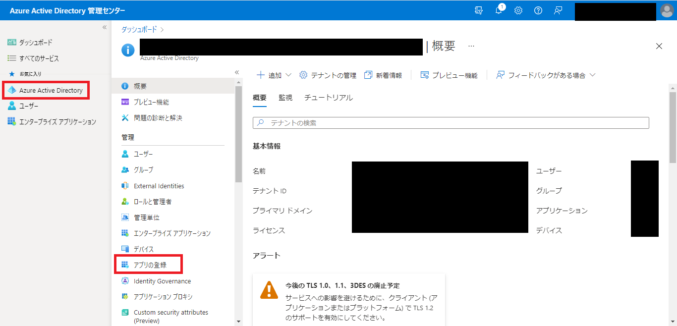 - 左ペインから[Azure Active Directory]を選択し、[アプリの登録]をクリックします。