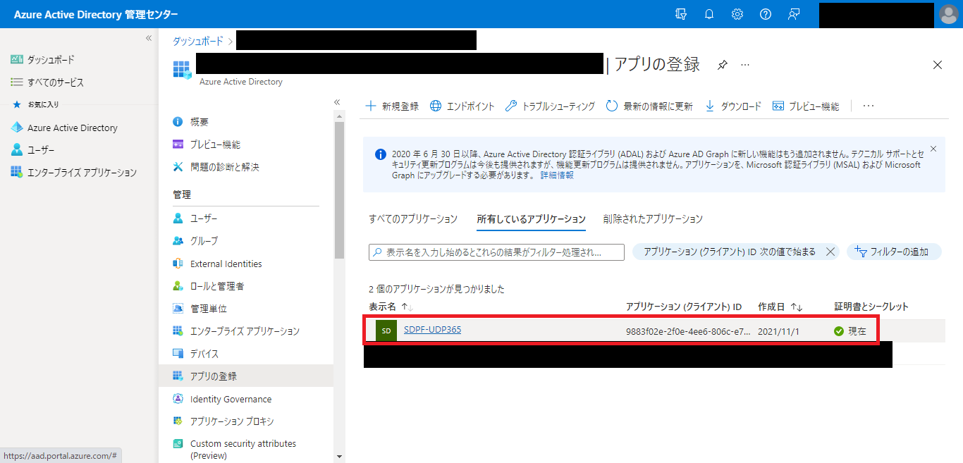 - 登録されているアプリのリストから、「1.1.5.2. バックアップ・リストアに必要な先進認証を準備する」で作成したアプリケーションをクリックします。