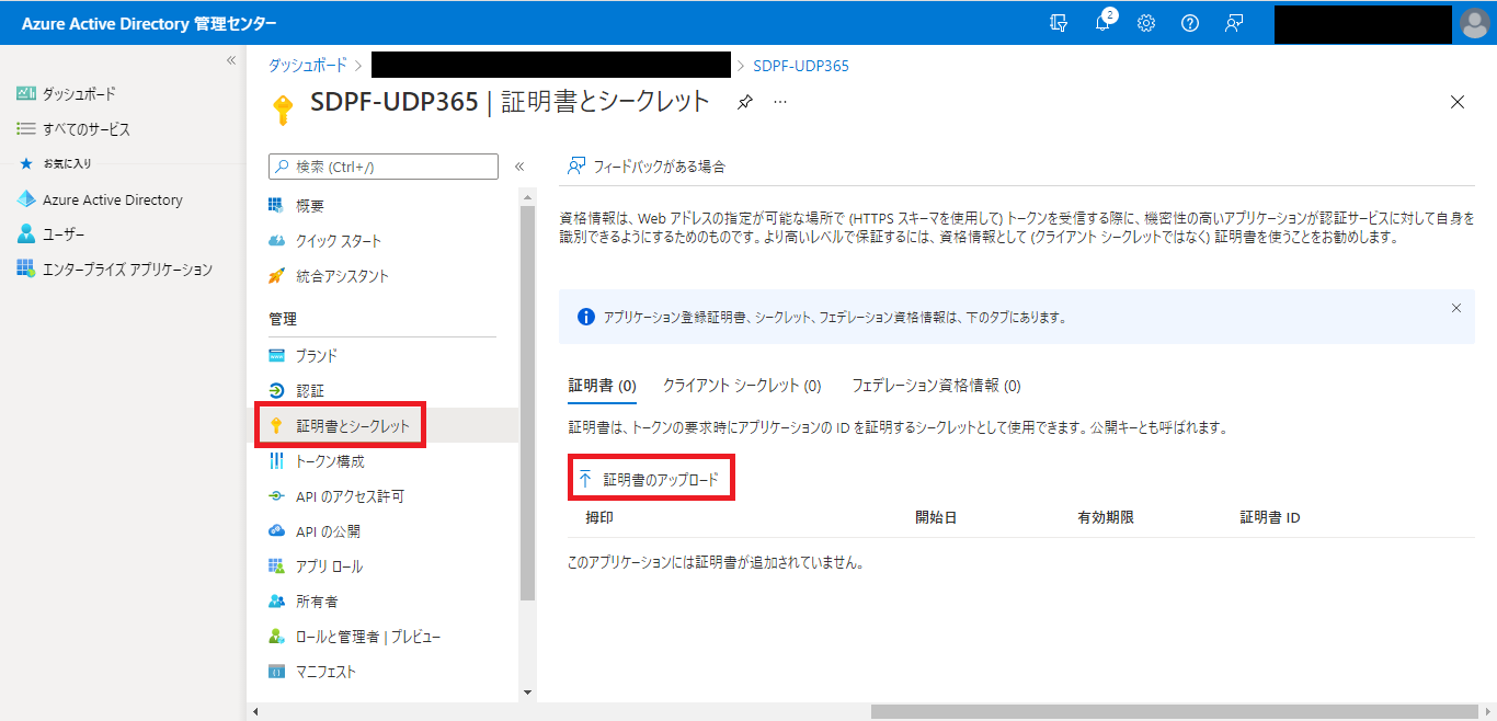 - [証明書とシークレット]に移動し、[証明書のアップロード]をクリックします。