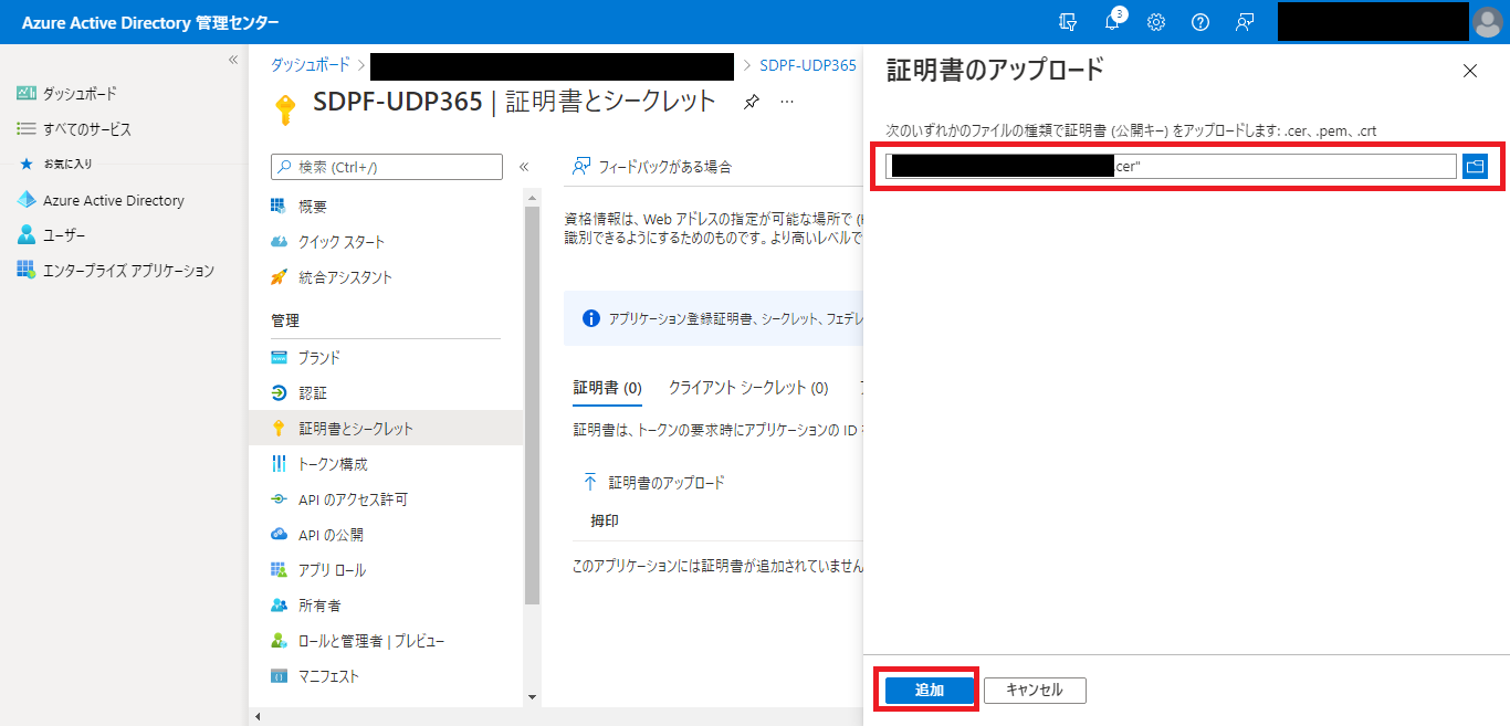 - 手順6でダウンロードした公開証明書を参照し、[追加]をクリックします。※証明機関から発行した公開証明書を利用する場合も同様にアップロードします。