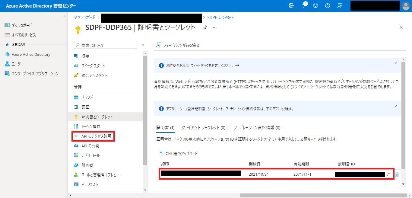 - 証明書のアップロードが完了したことを確認後、左側ペインから、[API のアクセス許可]を選択します。