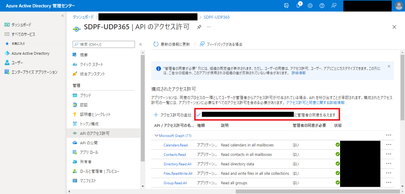 - [<テナント名>に管理者の同意を与えます]をクリックします。確認メッセージが表示されるため[はい]をクリックします。