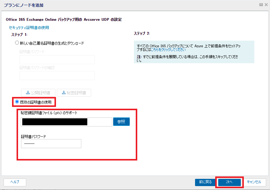- 既存の証明書を使用する場合は、[既存の証明書の使用]にチェックを入れ、「秘密鍵証明書ファイル(.pfx)のサポート」では、「新しい自己証明書の生成とダウンロード」の時にダウンロードした秘密証明書や、証明機関から発行した秘密証明書を参照します。証明書のパスワードを入力後、[次へ]をクリックします。