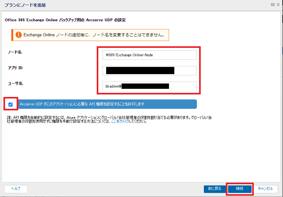 - 任意の「ノード名」と、「1.1.5.2. バックアップ・リストアに必要な先進認証を準備する」でコピーしたアプリケーション(クライアント)IDを入力します。「ユーザー名」には「アプリケーション偽装の役割の割り当て」で権限を割り当てたバックアップアカウントを入力します。[ArcserveUDPがこのアプリケーションに必要なAPI権限を設定することを許可します]にチェックを入れ、[接続]をクリックします。
