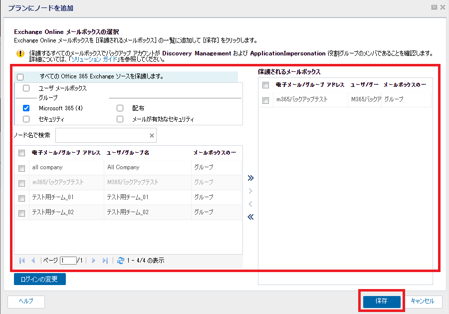 - ソースの選択画面が表示されますので、バックアップ対象のメールボックスやグループを選択し、「保護されるメールボックス」に追加後、[保存]をクリックします。