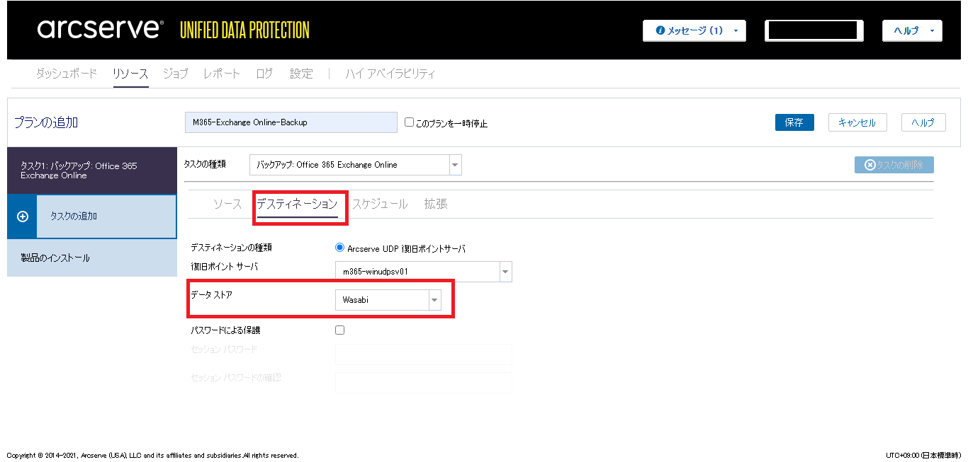 - [デスティネーション]タブの画面に遷移し、保存先の情報等を入力・選択します。「データストア」では「Wasabiデータストアの作成」にて作成したデータストアを選択します。