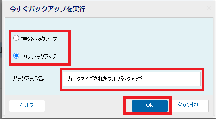 - ダイアログボックスにて、バックアップタイプと任意のバックアップ名を入力し[OK]をクリックします。バックアップジョブが開始されます。