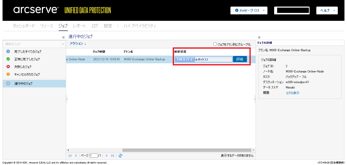 - [ジョブ]タブの画面に遷移し、[進行中のジョブ]をクリックすると、実行したバックアップジョブの進行状況が確認できます。