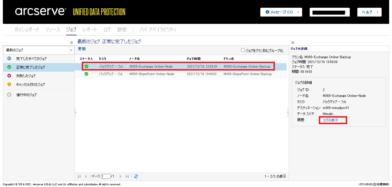 - バックアップジョブが終了後、[ログの表示]をクリックするとログを確認できます。