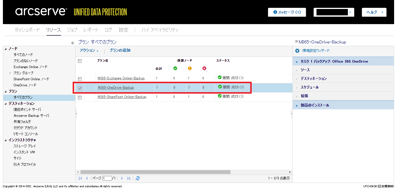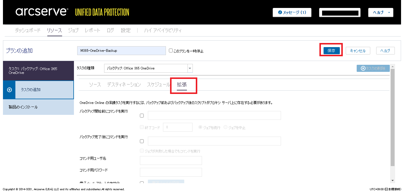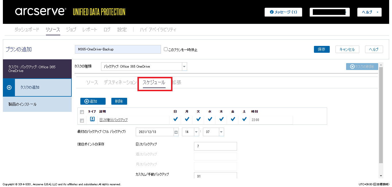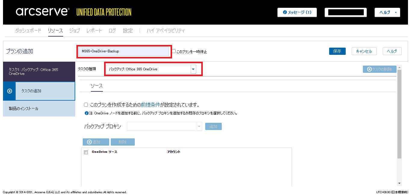 - 任意の「プラン」名を入力し、「タスクの種類」のドロップダウンリストで[バックアップ: Office 365 OneDrive]をクリックします。