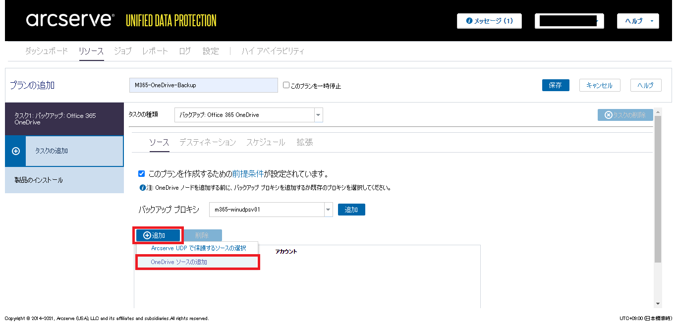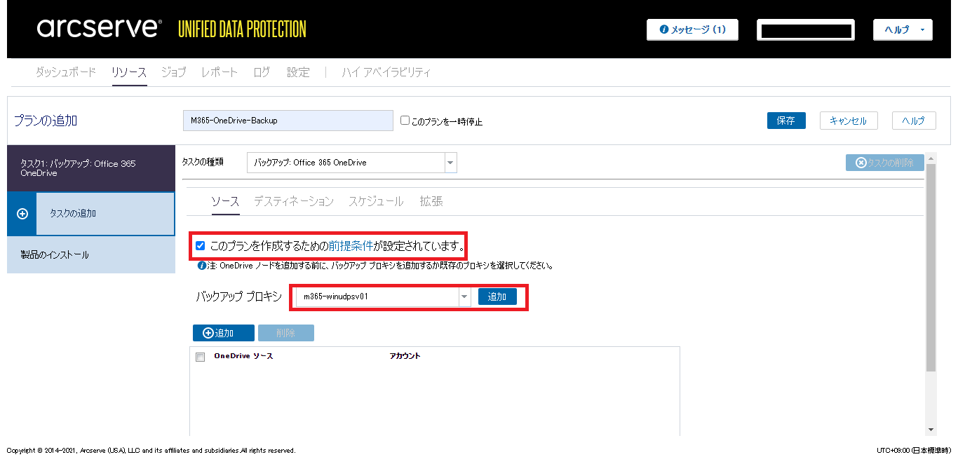 - [ソース]タブの[このプランを作成するための前提条件が設定されています。]にチェックを入れ、バックアッププロキシなどの必要な情報を設定します。