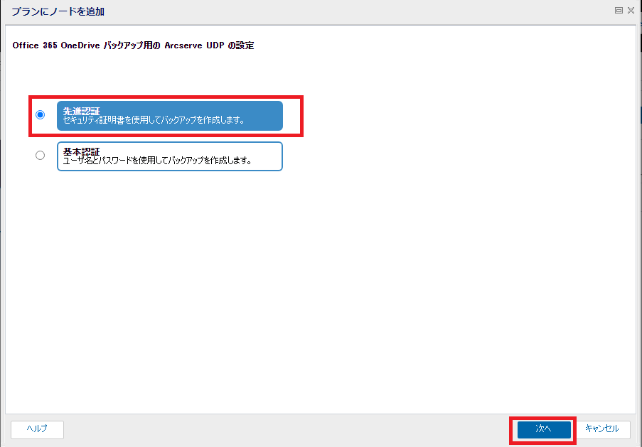 - 「プランにノードを追加」の画面が表示されるので、[先進認証]を選択し[次へ]をクリックします。