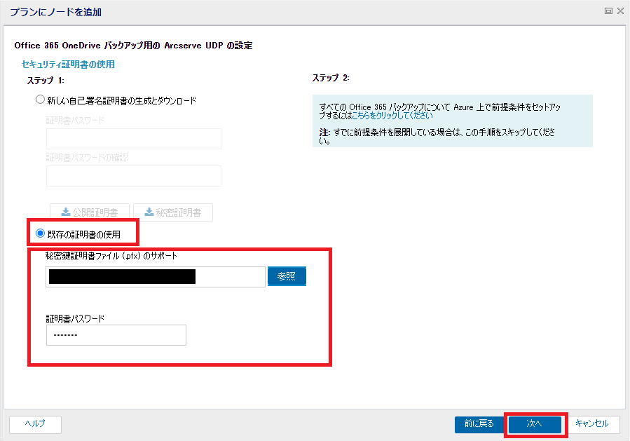 - 既存の証明書を使用する場合は、[既存の証明書の使用]にチェックを入れ、「秘密鍵証明書ファイル(.pfx)のサポート」では、「新しい自己証明書の生成とダウンロード」の時にダウンロードした秘密証明書や、証明機関から発行した秘密証明書を参照します。証明書のパスワードを入力後、[次へ]をクリックします。