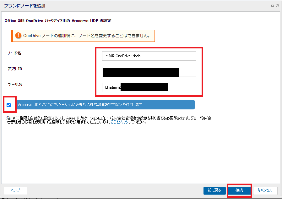 - 任意の「ノード名」と、「1.1.5.2. バックアップ・リストアに必要な先進認証を準備する」でコピーしたアプリケーション(クライアント)IDを入力します。「ユーザ名」には「アプリケーション偽装の役割の割り当て」で権限を割り当てたバックアップアカウントを入力します。[ArcserveUDPがこのアプリケーションに必要なAPI権限を設定することを許可します]にチェックを入れ、[接続]をクリックします。