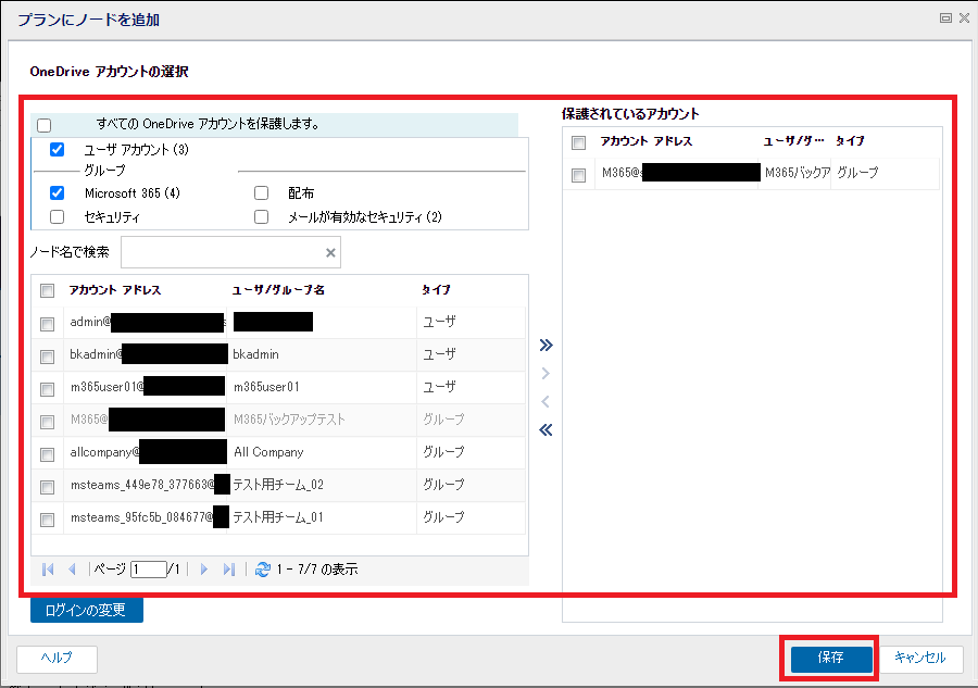 - ソースの選択画面が表示されますので、バックアップ対象のアカウントやグループを選択し、「保護されているアカウント」に追加後、[保存]をクリックします。
