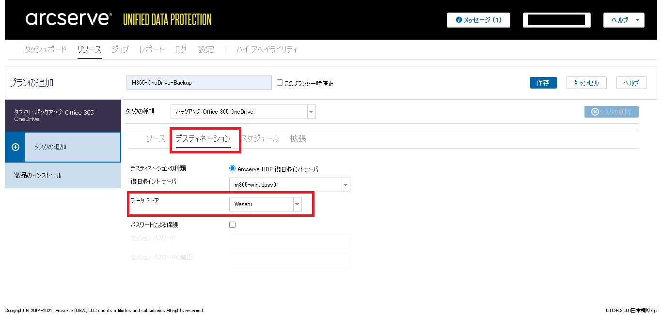 - [デスティネーション]タブの画面に遷移し、保存先の情報などを入力・選択します。「データストア」では「Wasabiデータストアの作成」にて作成したデータストアを選択します。