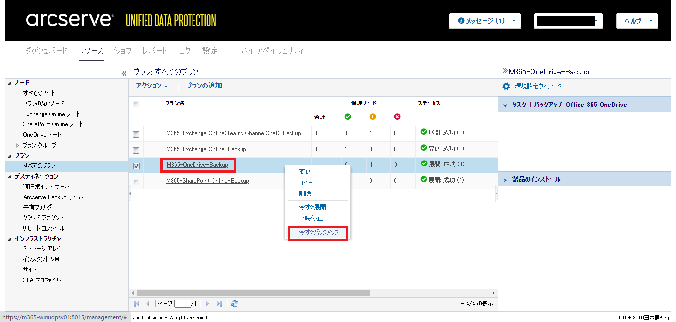 - 作成したプランを右クリックし、[今すぐバックアップ]をクリックします。