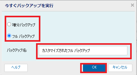 - ダイアログボックスにて、バックアップタイプと任意のバックアップ名を入力し[OK]をクリックします。バックアップジョブが開始されます。