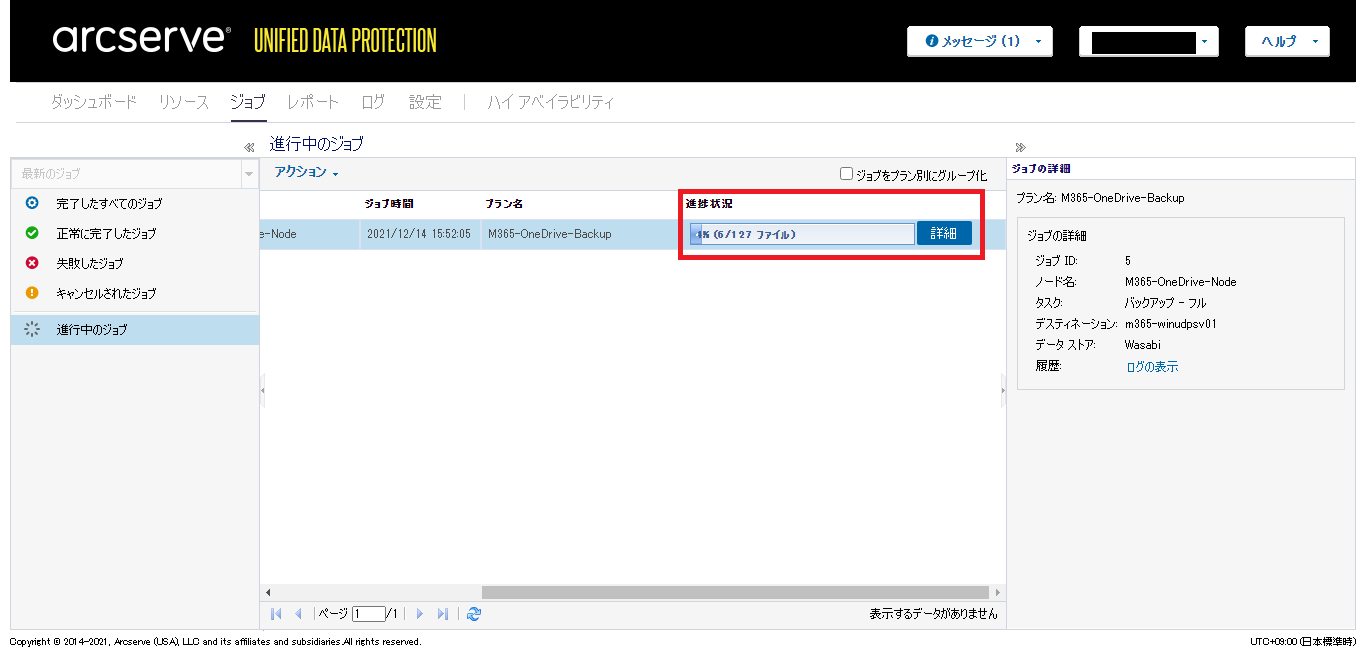 - [ジョブ]タブの画面に遷移し、[進行中のジョブ]をクリックすると、実行したバックアップジョブの進行状況が確認できます。