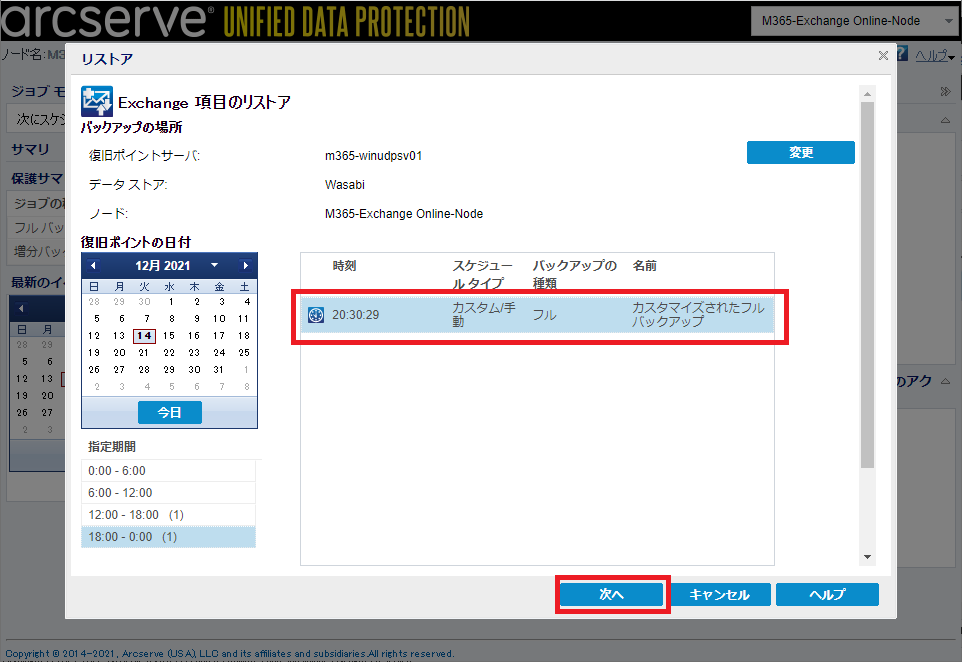 2. 「Exchange 項目のリストア」のダイアログ ボックスが表示されるので、復旧ポイントを選択し、[次へ]をクリックします。