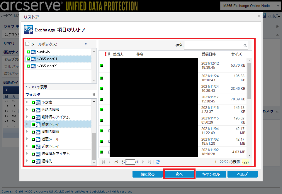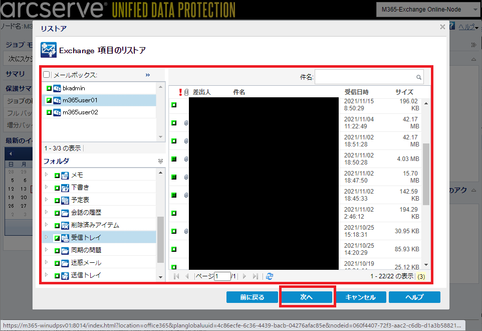 3. 「メールボックス」のペインでリストアするメールボックスを選択し、[次へ]をクリックします。