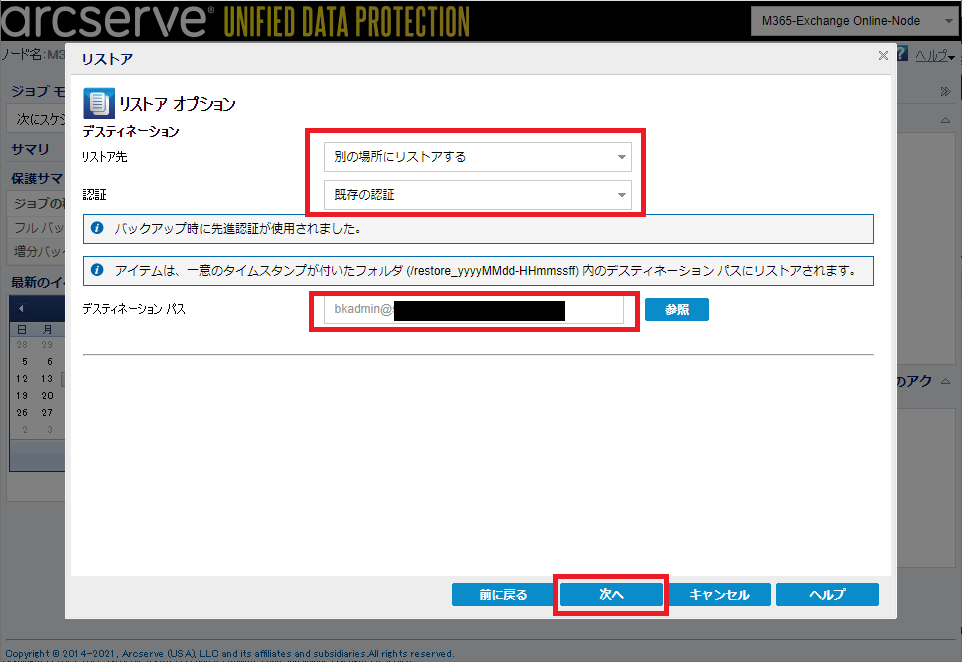 デスティネーションパスではどのアカウントのメールボックスにリストアするかを設定します。