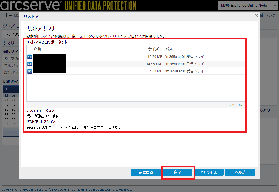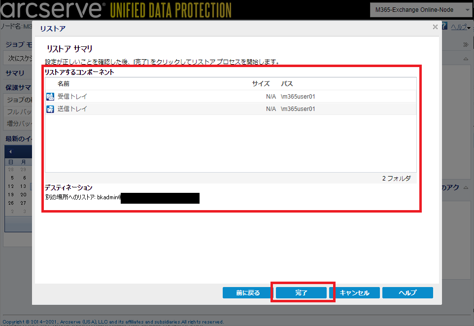 5. リストアサマリ画面にてリストア内容を確認し、問題なければ[完了]をクリックします。