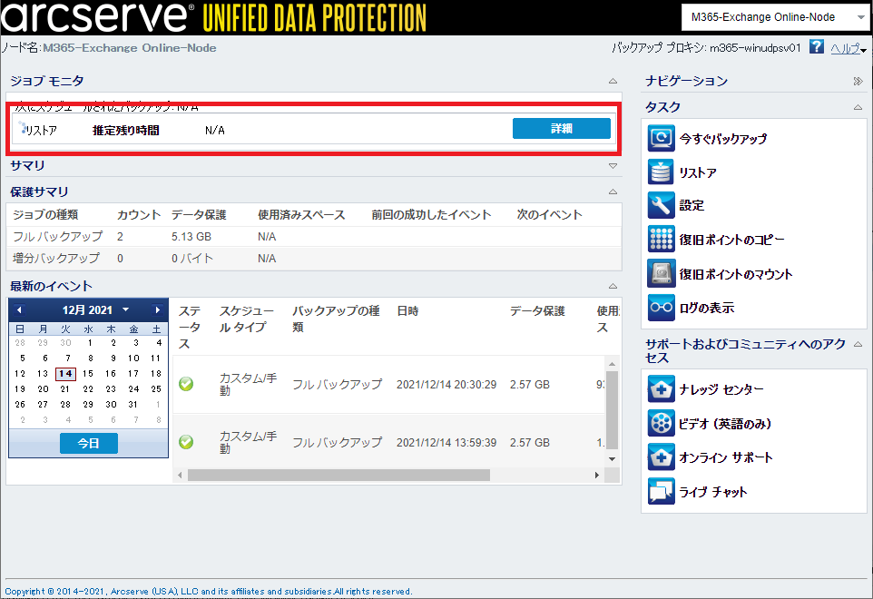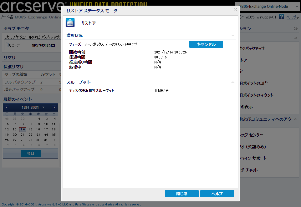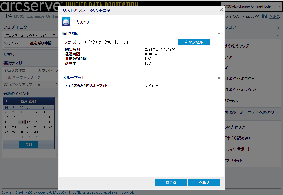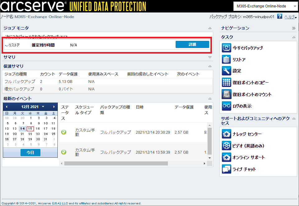 ※M365サービスをリストアする場合、ステータスが「リストア開始中」のままとなっており、推定残り時間などの情報が「N/A」表記で正常に表示されませんがリストア処理は実行されます。