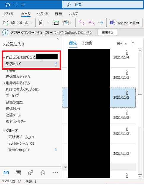 8. リストア先アカウントの環境にてOutlookを起動すると、リストアされた内容が反映されていることを確認できます。