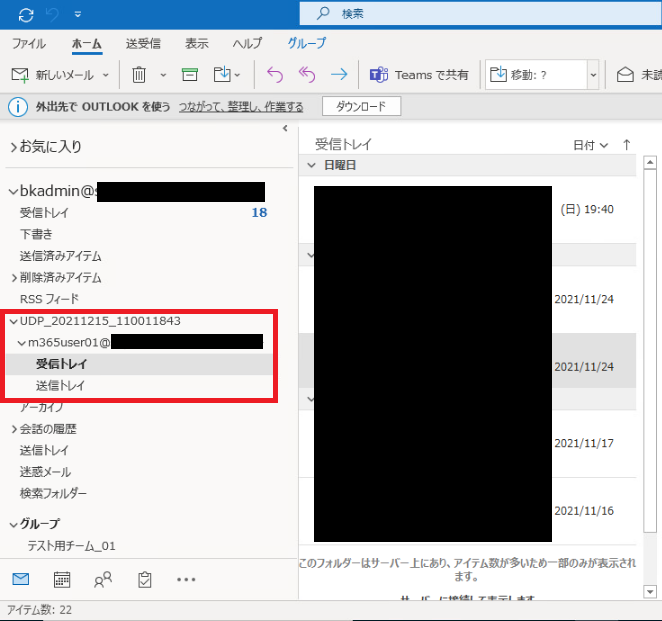 8. リストア先アカウントの環境にてOutlookを起動すると、「UDP_YYYYMMDD_XXXXXXX」のフォルダ内からリストアされた内容が反映されていることを確認できます。