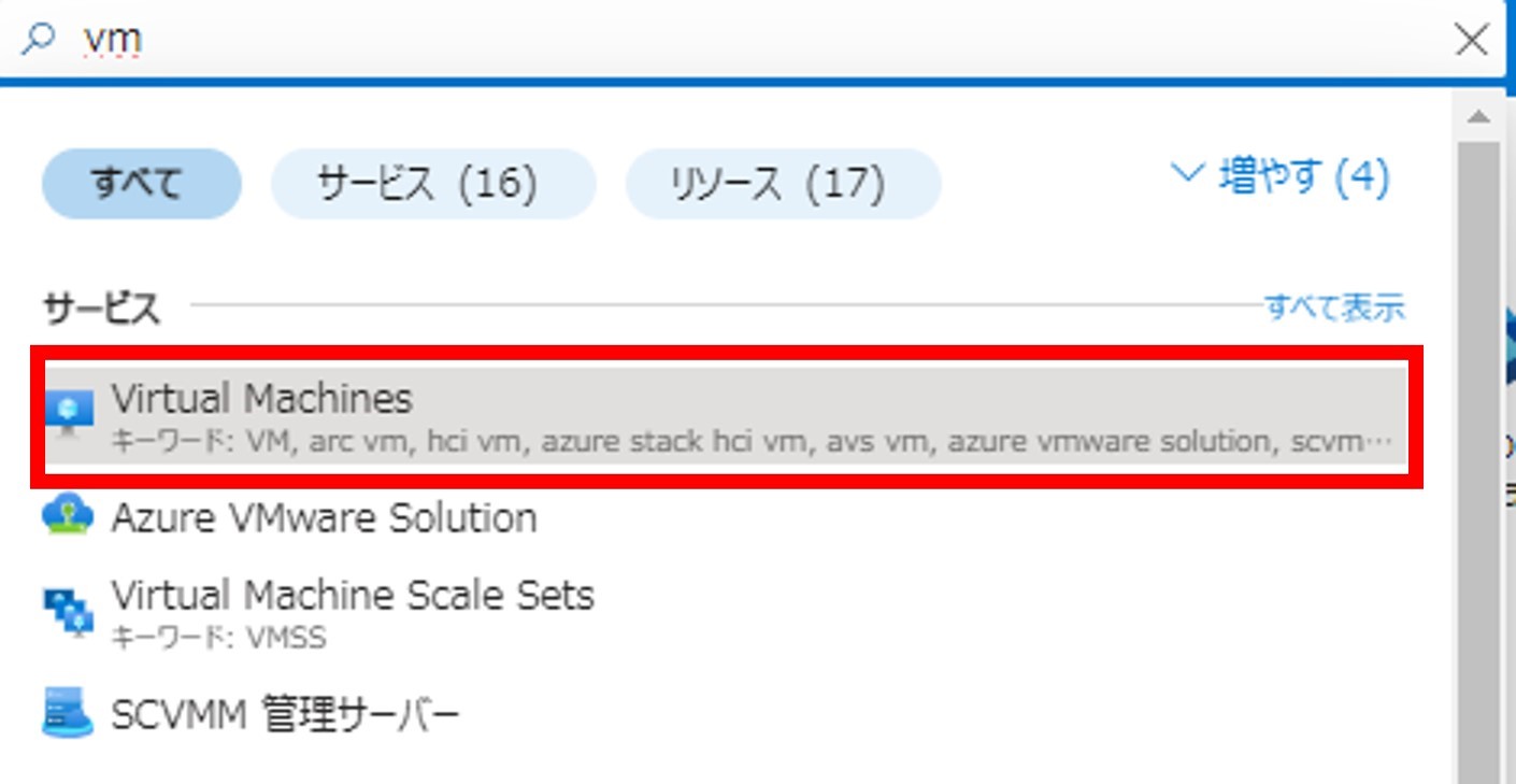 画面上部の検索欄に「vm」と打ち込み、[サービス] > [Virtual Machines]をクリックします。