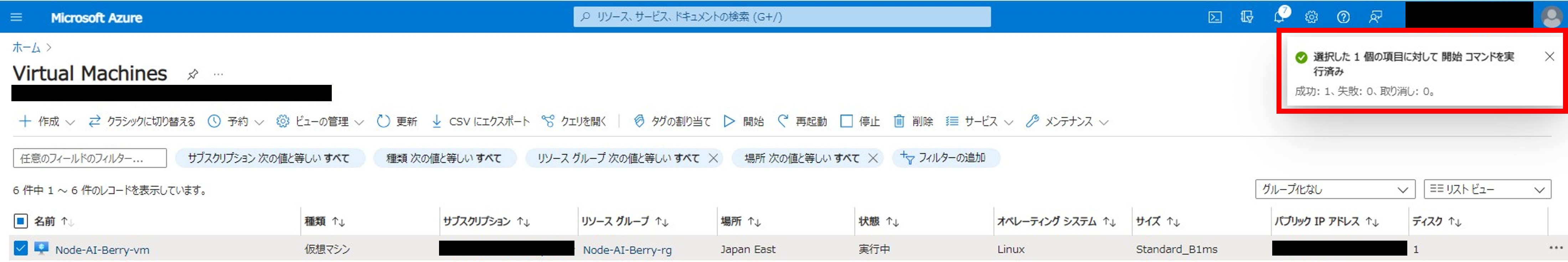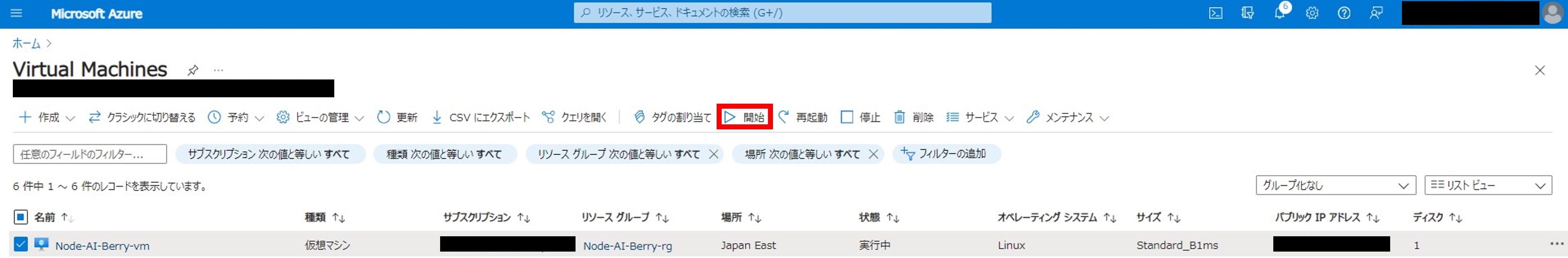 「1.1.3.2. Microsoft Azureに仮想マシンを構築する - 仮想マシンを作成する」で作成した仮想マシンのチェックボックスをクリックします。