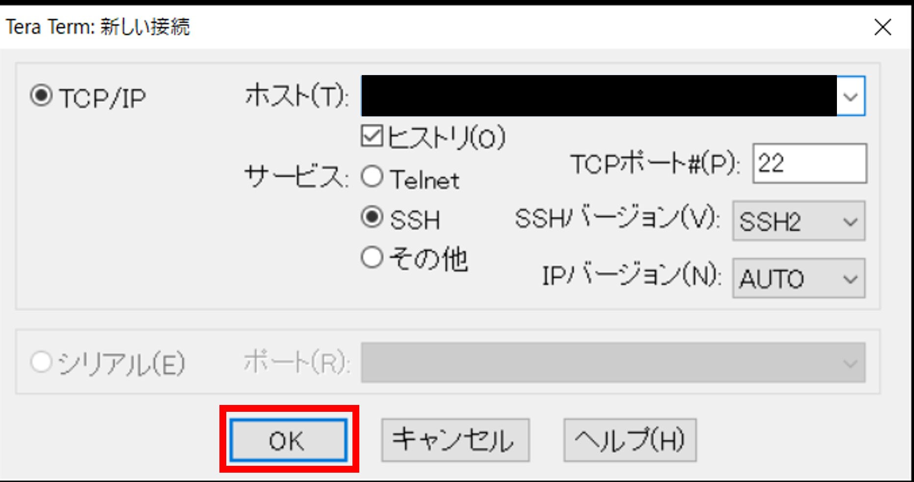 「Tera Term: 新しい接続」タブにて[TCP/IP]を選択して下記のパラメーターを入力し、[OK]をクリックします。