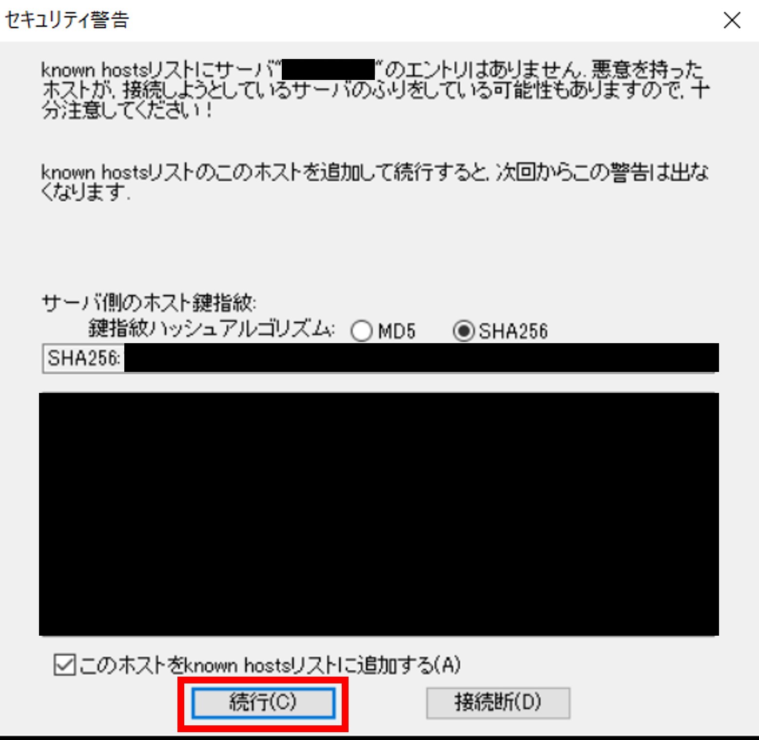 「セキュリティ警告」タブが表示された場合は、デフォルトのまま[続行(C)]をクリックします。