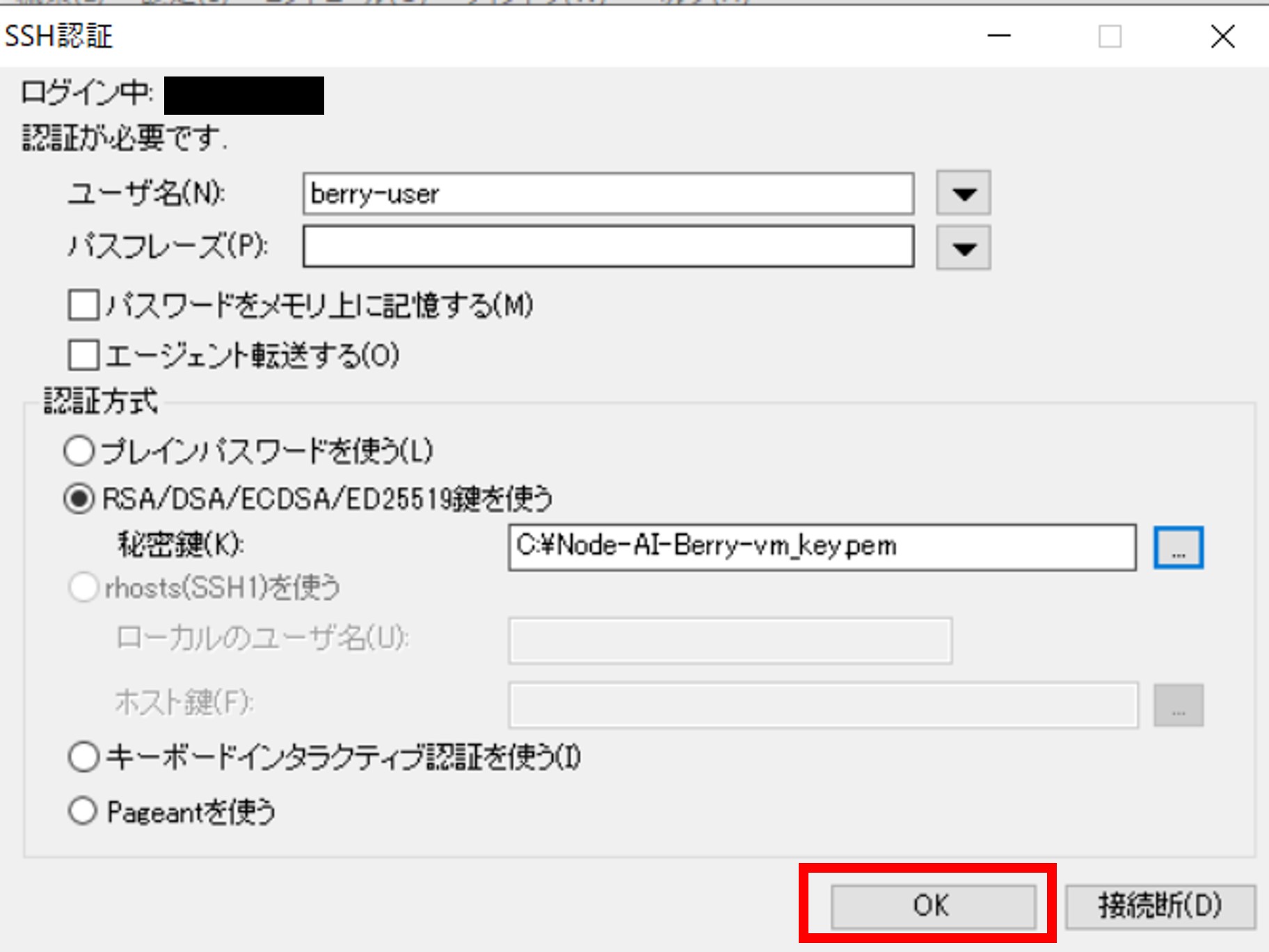 <「1.1.3.2. Microsoft Azureに仮想マシンを構築する - 仮想マシンを作成する」で保存した秘密キーのファイルパス(例:C:\Node-AI-Berry-vm_key.pem)>
