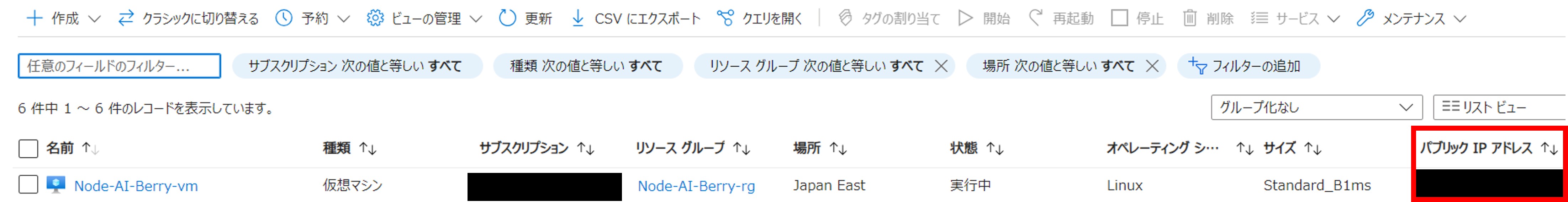 「パブリック IP アドレス」に記載されているIPアドレスを控えます。