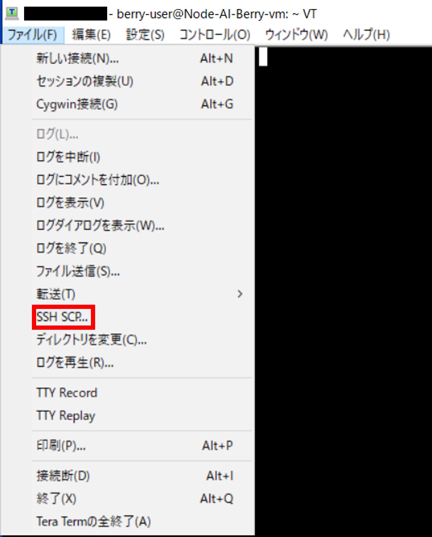 Tera Termの上部の[ファイル(F)] > [SSH SCP...]をクリックします。