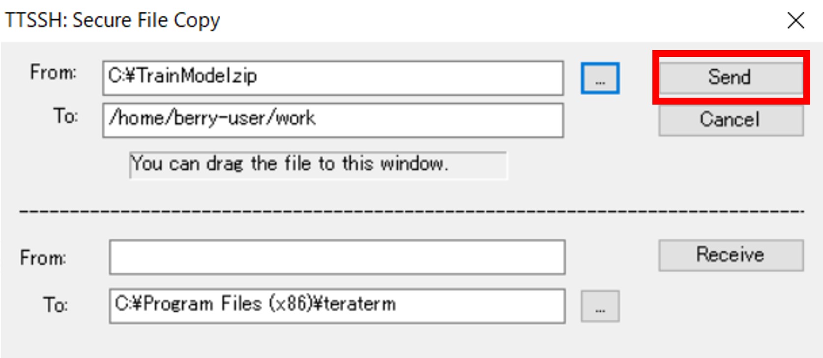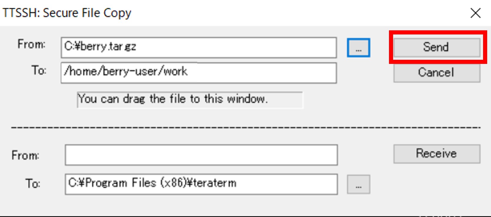 「TTSSH: Secure File Copy」タブの上側の入力欄に下記パラメーターを入力し、[Send]をクリックします。
