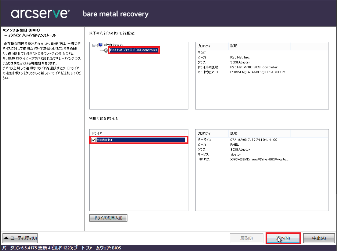 21.ドライバの検出が完了すると、「Red Hat VirtIO SCSI controller」を選択し、利用可能なドライバにて、「viostor.inf」をチェックし、「次へ」ボタンをクリックします。