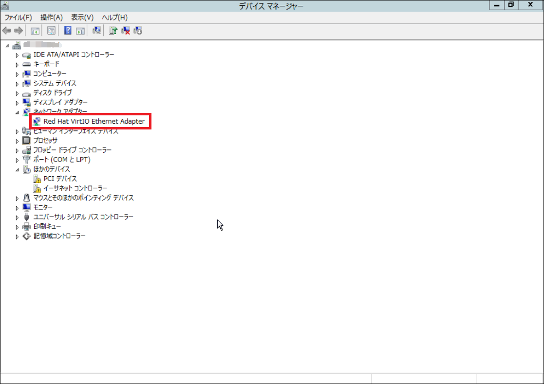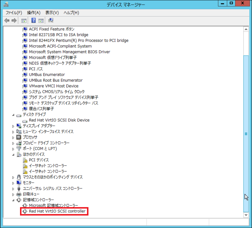 デバイスマネージャーを開き、「記憶域コントローラー」に「Red Hat VirtIO SCSI controller」が認識されていることを確認します。