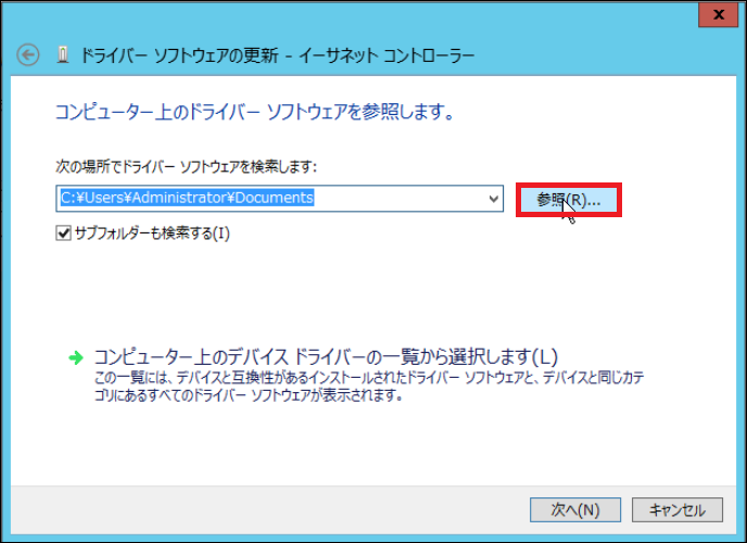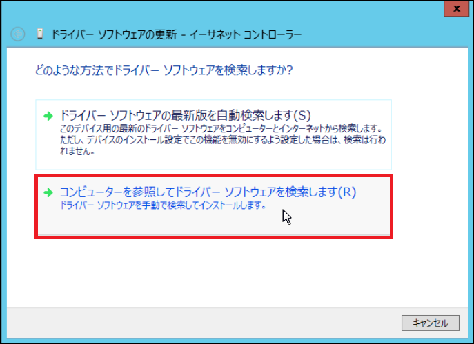 <ドライバーソフトウェアの更新 - イーサネットコントローラー>にて、「コンピューターを参照してドライバーソフトウェアを検索します」をクリックします。