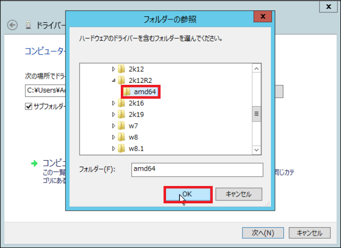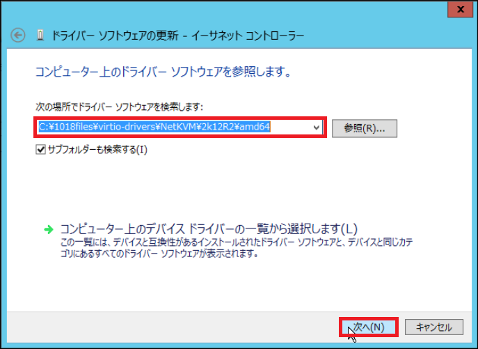 ドライバーファイル(virtio-win iso内のNetKVM2k12R2amd64)選択し、「OK」をクリックします。