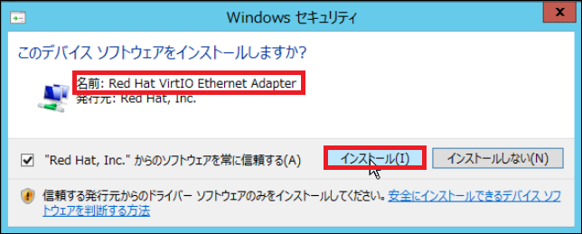名前に「Red Hat VirtIO Ethernet Adapter」が表示されていることを確認し、「インストール」をクリックします。