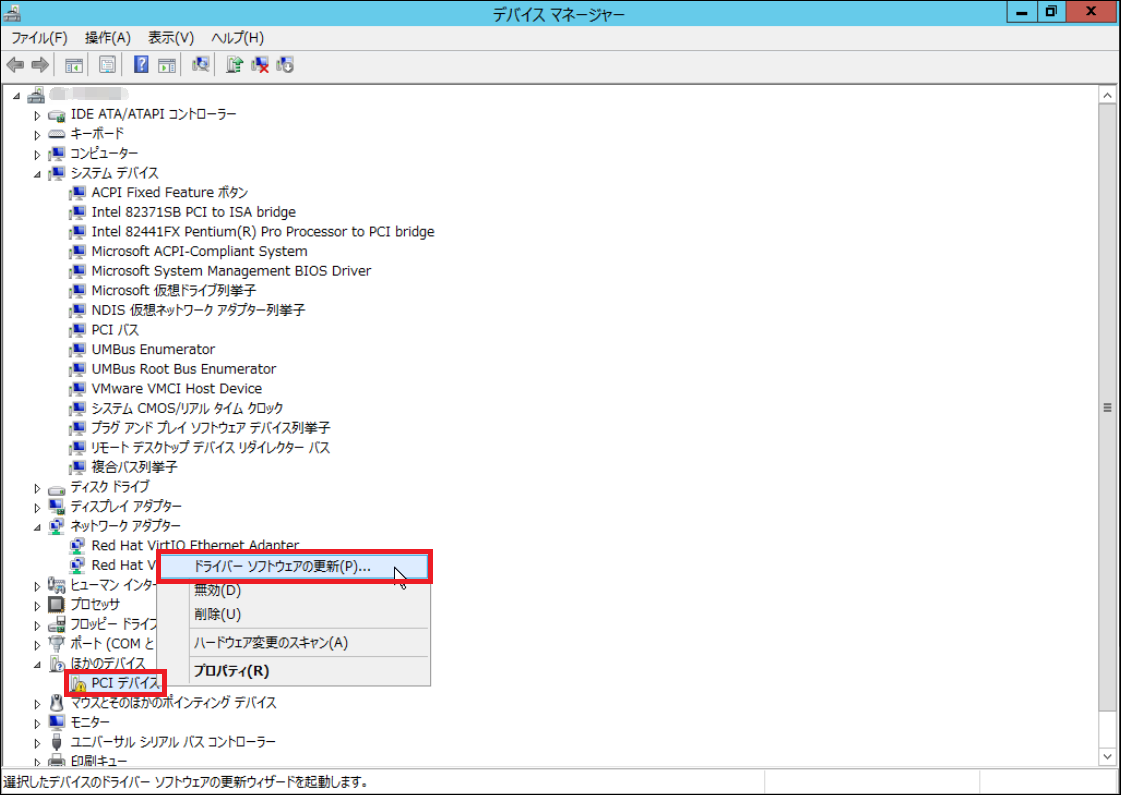 「ほかのデバイス」−「PCIデバイス」を右クリックし、「ドライバーソフトウェアの更新」をクリックします。