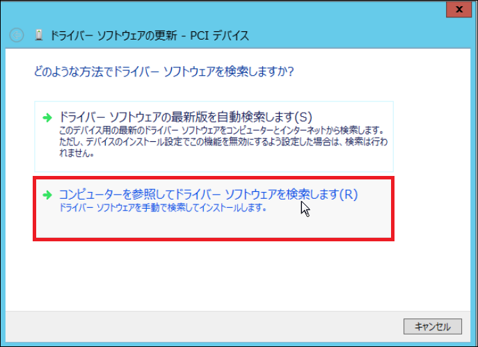 <ドライバーソフトウェアの更新 - PCIデバイス>にて、「コンピューターを参照してドライバーソフトウェアを検索します」をクリックします。